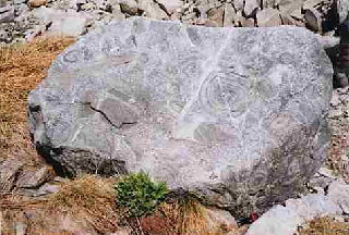 楕円形で長辺は1.5m、短辺1.0m程の緑ぽい石である。周辺の岩は白味をおびたものが多いがこの石だけは緑色である。全体に丸い形になっているのは山頂付近からこの位置まで転落してきたからではないだろうか。その山頂は三俣蓮華岳だ。石の表面には大小の丸い輪の模様が幾つもついている。「球状緑星岩」だと聞いて、なるほどうまい表現(名付け)だと思った。