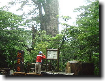 安房から淀川登山口まではタクシーで1時間。この区間にはヤクスギランド、紀元杉、川上杉と見るところが多い。登山口から淀川小屋までは歩いて40分もあれば充分である。 今夜の夕食は握り飯を準備しているし、5時までに小屋入りすればよいと計算していた。三ヶ所をゆっくり見物するつもりだというと「あんた方はな、山を縦走して縄文杉やら夫婦杉なんかを見なさるけん、ヤクスギランドには行く必要はなか。あそこは山に登らん人の見るところじゃ」とあっさり運転手さんからけられた。 それよりも雨が降っているから少しでも小屋に早く着いて寝る場所を確保するのが先だというのである。この天候では小屋泊りの人は少なかろうと運転手さんとは逆な考えをしていたが事情に精通した運転手さんの意見に従うことにした。 狭い道を大型の観光バスが何台も下りてきた。紀元杉やヤクスギランドを見物して帰るバスだという。紀元杉に着くと車を停めて写真を撮るまで待ってくれた。幸いに紀元杉では雨は小雨になっていた。合羽は着らないでカメラだけ持って階段を降りる。