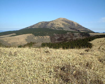 ヒゴタイキャンプ村から八丁原登山口まで時間にして20分である。 登山口から見あげる一目山。 枯野と澄み切った青空のコントラストのすばらしさをご覧ください。 枯草の下はクロボク、その上には針のように立った霜柱。サック、ザックと踏みしめて登る気分は最高だ。 前屈みになって登る姿勢に腹が邪魔になるのは昨夜のご馳走の食べすぎか。 |