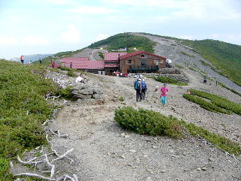 とうとうやって来た。蝶ヶ岳フュッテである。 蝶槍から歩くこと1時間、身体よりも精神的な疲れが大きい。精神的な疲れは一夜を過ごせば回復できる。 身体の故障もなくここまで来れたことをわが身に感謝しなければ・・・。 |