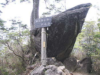 ときどき雨粒が落ちてきて、いよいよ雨かと観念せる状態が2度ほどあった。 そのたびに、もうこの年齢では、またとこの山に登る機会はないだろうと思うと、どうしてもきょう山頂まで極めておきたいと思う気持ちが強くなってくる。 周りの景色を眺める余裕はなく、ただピークをめざす気持ちだけである。 念願の山頂に立ったのは14時55分。2時間35分の奮闘であった。 視界はガスで何も見えなかったが心は満足感で晴れやかである。一度はこの足で制覇しておきたいと思いつづけていた市房山であったから・・・。 |