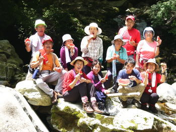 ![]() 下りは登りよりの30分短縮して帰り着いた。 沢に下り、甘茶滝の滝壷で、昨日から車のクーラーで冷やしていたスイカを食べた。 山に登ってきた充実感と汗をかいたあとの喉の渇きで最高のスイカであった。 |
