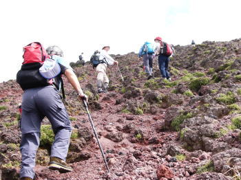 | 腹ごしらえが終わり、再び頂上を目指す。 御鉢を過ぎると下りになる。 何時も山登りで思うのだが、せっかく稼いだ高度を下りでマイナスにして、また苦労して登るのが勿体無い。 ここも高度で20mはマイナスである。 遠くから眺める高千穂の峰の山肌はなだらかに見えるが近づいてみるとかなり山肌は崩落しいる。 この斜面に、はまり込んだらアリ地獄で這い上がれないだろう。 |