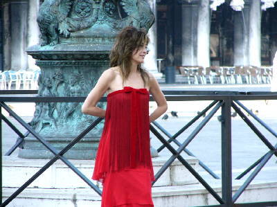 | サン・マルコ広場のモデル(ヴェネツィア) 日中のサン・マルコ広場は観光客でごったかえしになります。混雑を避けて朝早く出かけてみました。 10人ばかりの集団が写真を撮っていました。 近寄ってみると日本人でした。この人たちも混雑を避けこの時間帯に撮影しているようです。 カメラマンがポーズをあれこれ指示してなかなか決まりません。その合間に横から拝借したものです。 バックの建物はサン・マルコ寺院です。 |
