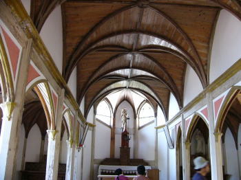 旧五輪教会 ガイドブックによると、 木造の旧聖堂は明治14年(1881)に建てられたもので、下五島では最古の教会建築。もともと久賀島のカトリックの中心である浜脇教会の聖堂として建築され、昭和6年(1931)に現在地に移された。内部はゴシック様式という明治初期の教会堂建築史を物語る貴重な天主堂といわれる。 外から見ると何処にでもある木造の家と変わらないが内部は木造でありながら曲線を多用した造りになっていた。 |