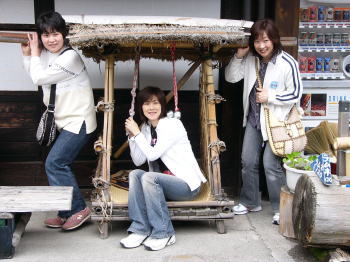 | 仲良し3人組。 記念の写真を撮っているところへさしかかり、ちょっと失礼!と横からシャッターを押した。 駕籠かきの「えっさ!ほっさ!」の掛け声、この3人知っているだろうか。 |