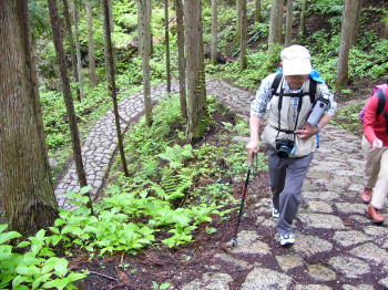 | この階段、当時のままかどうかは分からないが舗装されていないので昔の風情を一番感じる場所であった。 草鞋を履いて着物の裾を腰帯にからげ足早に走る飛脚の姿が浮かんでくる。 |