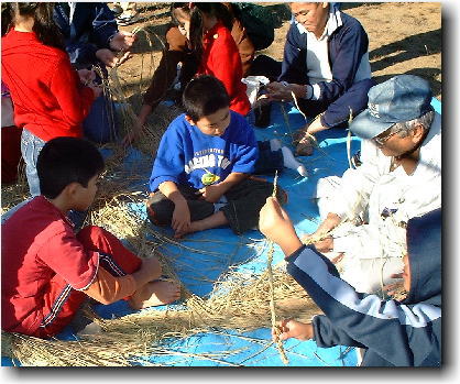 しめ縄つくり。 さすがは昔とった杵柄、先生の手元はよどみなく動く。 それを見る子供たち。 |