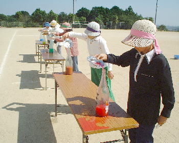 一升懸命がんばれ。 灰皿に水を汲み15Mほど走り一升瓶に入れる。 スタートへ戻り次の走者に灰皿を渡しリレーする。10分間に入れた量で勝敗を決める。 これも得点競技になる。 |